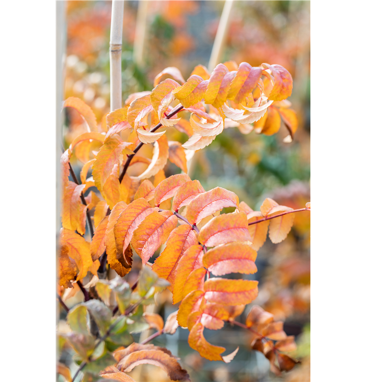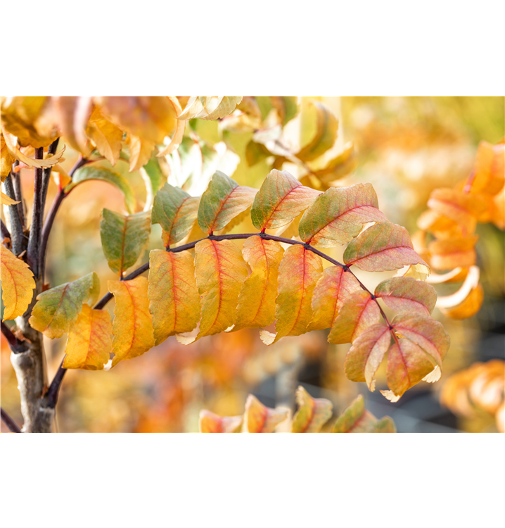 Die sommergrünen Blätter der Pyramiden-Eberesche 'Fastigiata' sind mittelgrün, gefiedert, matt, wechselständig.