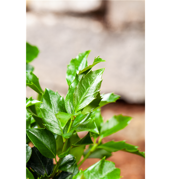 Die immergrünen Blätter der Stechpalme 'Blue Maid' sind dunkelgrün, lanzettlich.