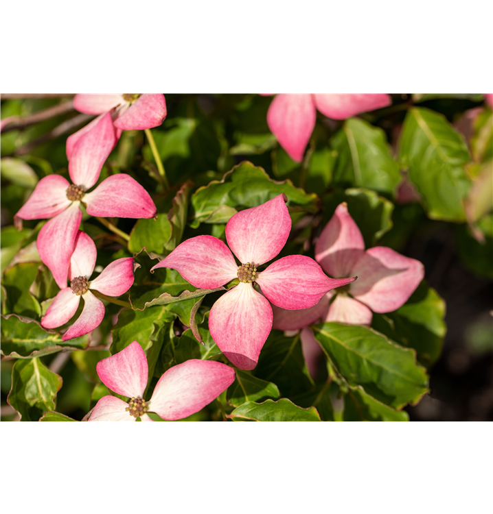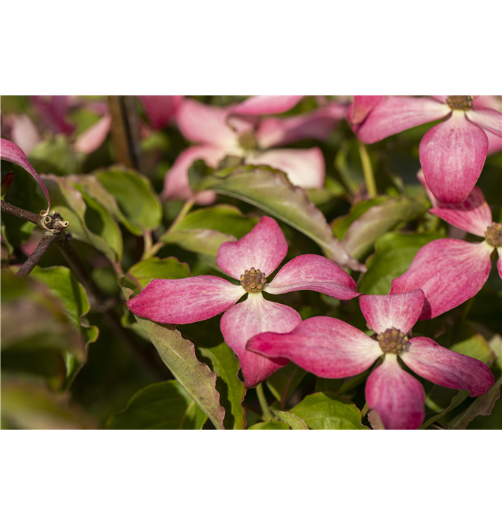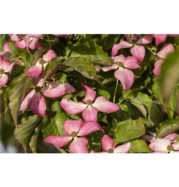 Aus diesen gehen ab September rosarote, runde Früchte hervor. Zudem trägt der Japanische Blumen-Hartriegel 'Scarlet Fire'®, eiförmige, dunkelgrüne Blätter. Der purpurrote Austrieb ist ebenso ein interessanter Anblick. An einem sonnigen bis halbschattigen Standort mit durchlässigem, humosem, kalkfreiem, sandigem Boden erreicht er gewöhnlich eine Höhe von ca. 6 m und wird ca. 5 m breit.