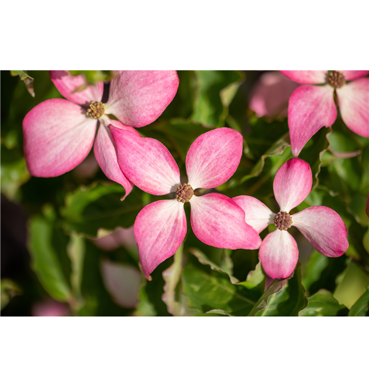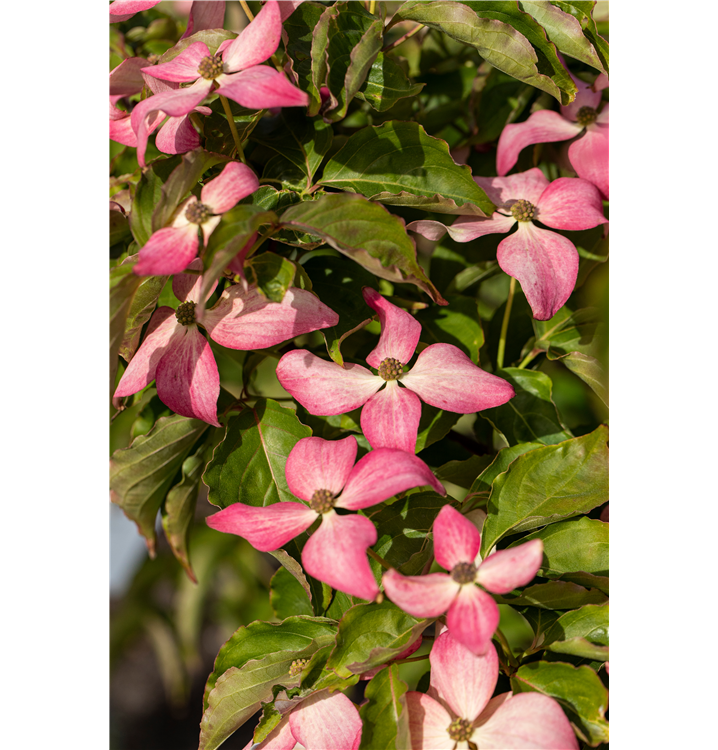 Besonders dekorativ sind die rosaroten, runden Beeren von Cornus kousa 'Scarlet Fire'®. Diese erscheinen ab September.