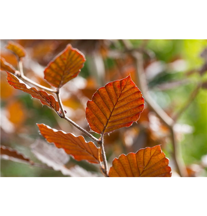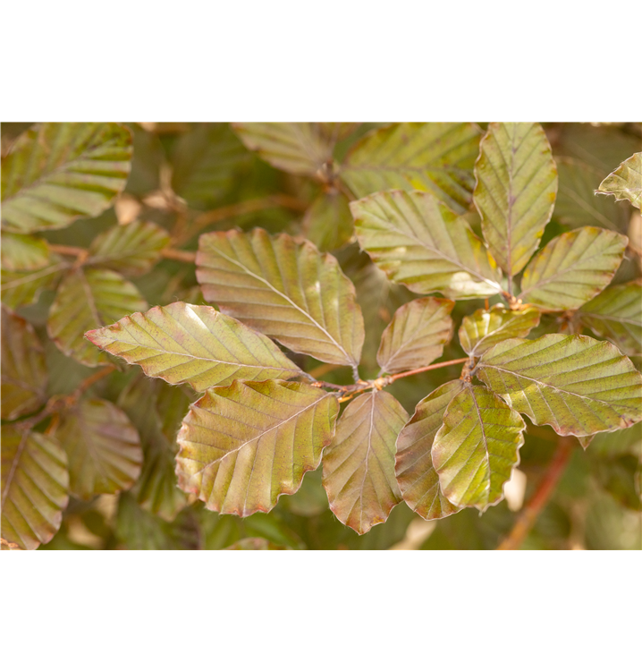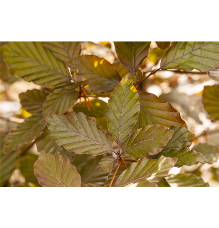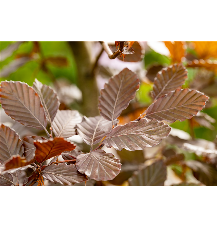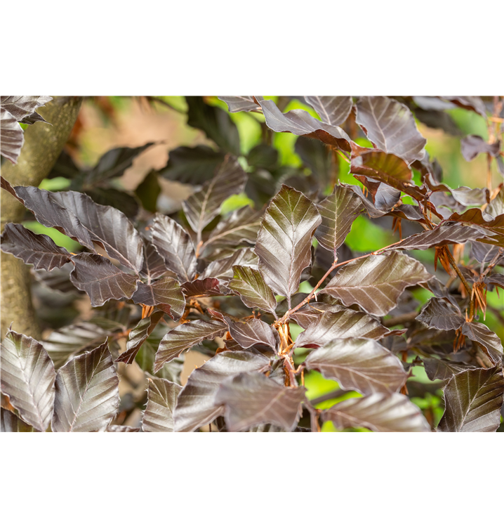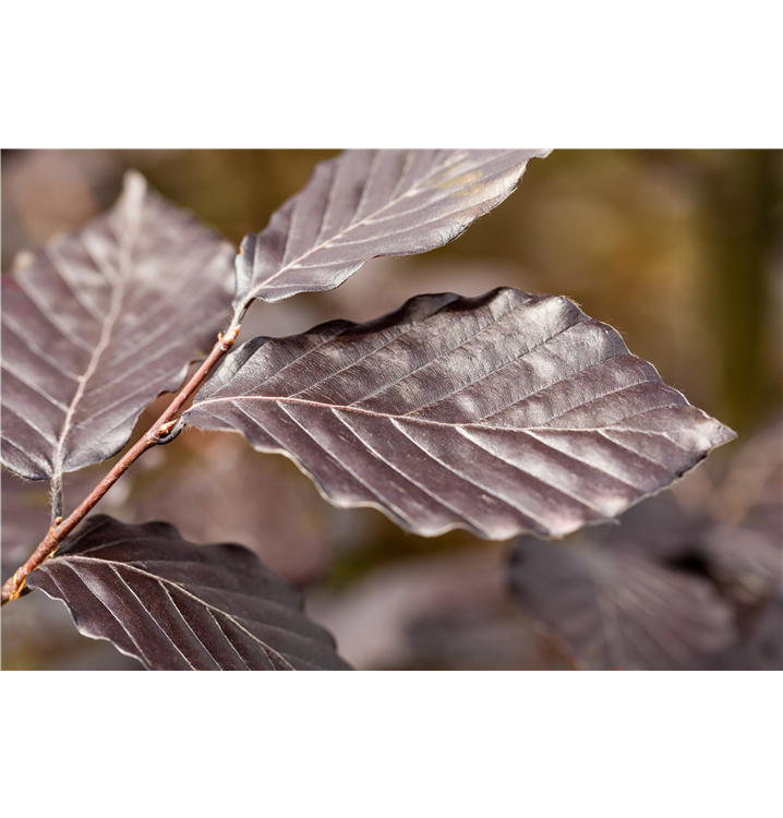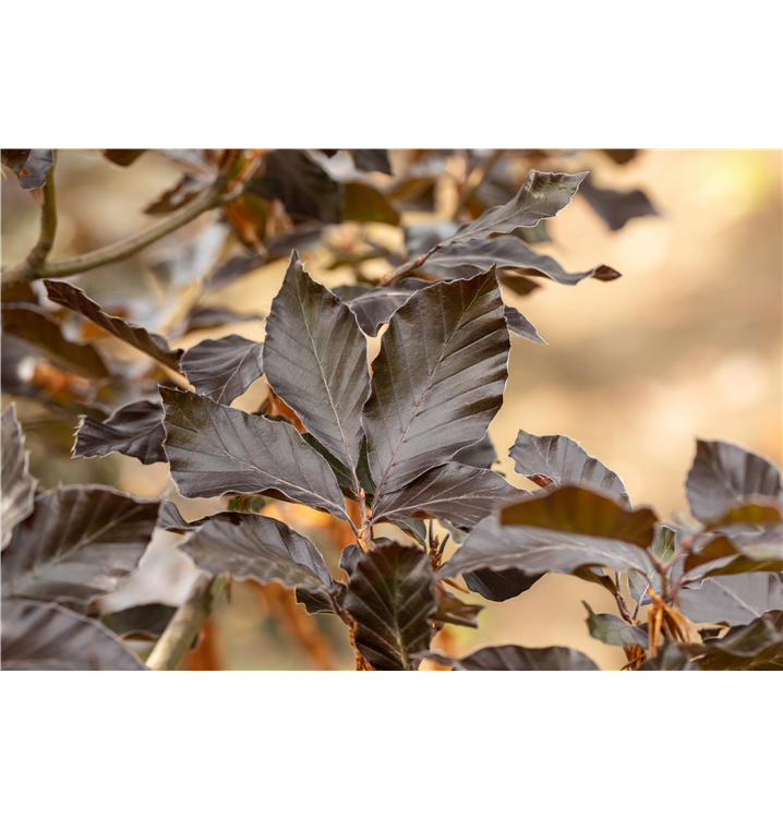 Hoher Blattschmuckwert. Die sommergrünen Blätter der Blutbuche sind schwarz-rot, eiförmig, wechselständig, gewellt. Diese sind etwa 5 - 10 cm groß. Dunkelroter Austrieb. Blutbuche zeigt sich leuchtend rot-braun im Herbst.