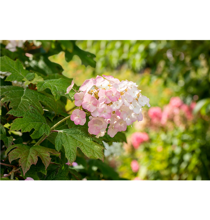 Die weißen, später rosafarbenen Blüten der Eichenblättrigen Hortensie 'Jetstream' FE® erscheinen in Rispen von Juni bis August. Diese werden etwa 10 - 20 cm groß und sind leicht duftend.