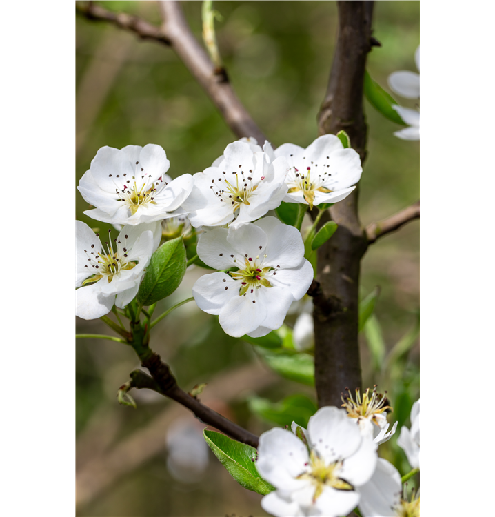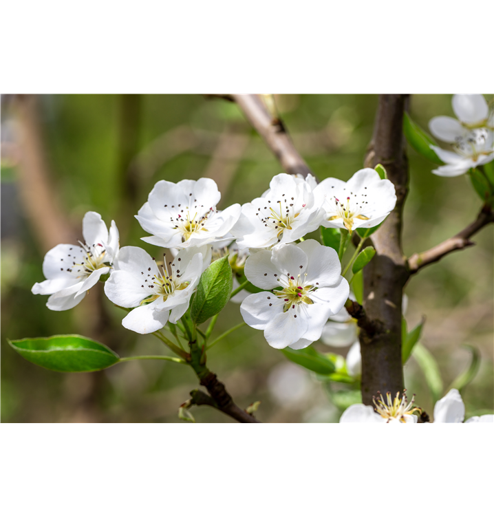 Pyrus communis 'Clapps Liebling' bildet in Doldentrauben angeordnete, weiße Blüten ab April.