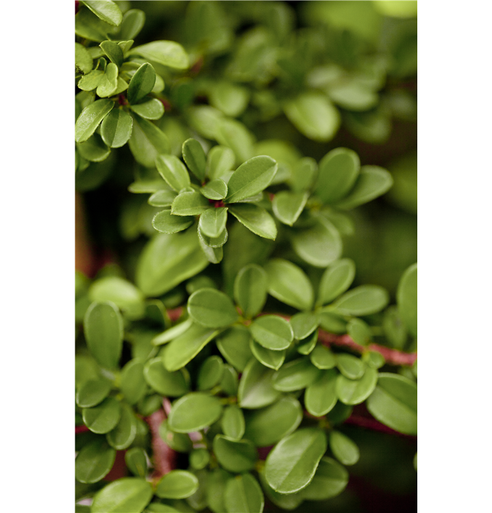 Die immergrünen Blätter der Teppichmispel 'Frieders Evergreen' sind dunkelgrün, rundlich, wechselständig.