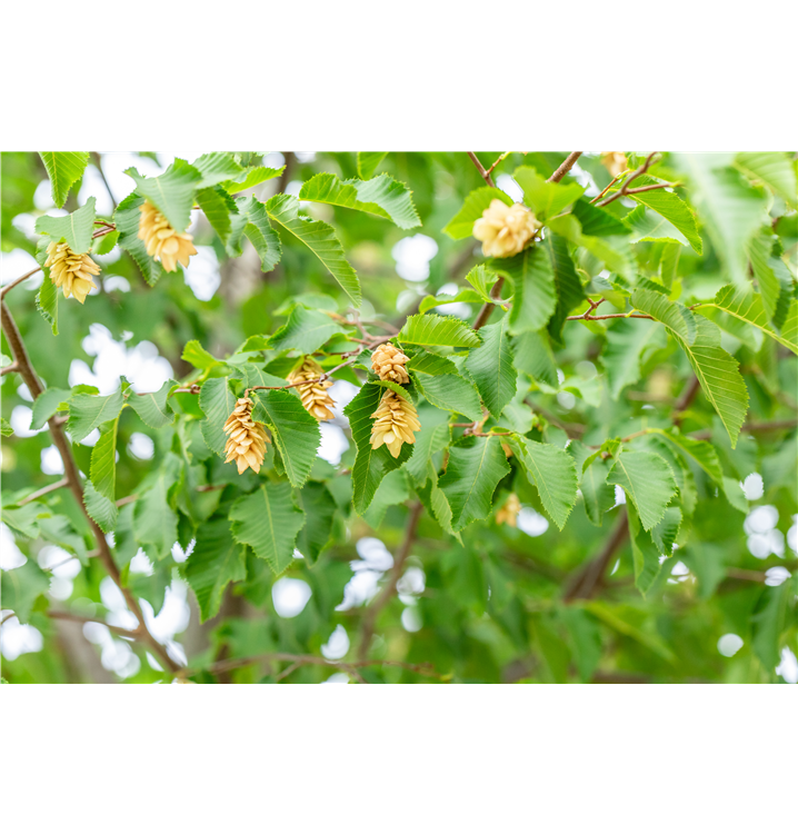 Die Gewöhnliche Hopfenbuche (Ostrya carpinifolia) ist ein rundlicher Baum mit dekorativen, hellbraunen Früchten. Diesen voraus bringt sie von Ende März bis Mai gelbe, in Kätzchen angeordnete Blüten hervor. Zudem trägt die Gewöhnliche Hopfenbuche, eiförmige, dunkelgrüne Blätter. An einem sonnigen, windgeschützten Standort mit kalkhaltigem, nährstoffreichem, sandigem Boden erreicht sie gewöhnlich eine Höhe von ca. 20 m und wird ca. 15 m breit.