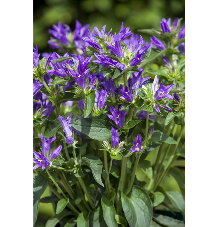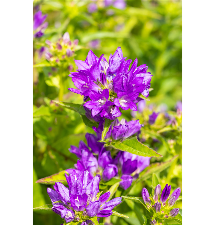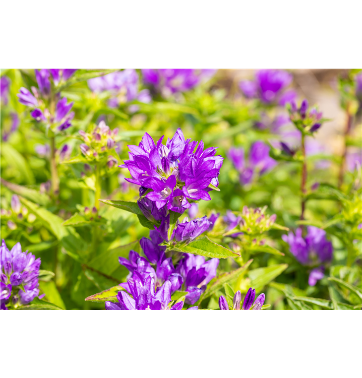 Campanula glomerata 'Acaulis' bildet glockenförmige, in Quirle angeordnete, violette Blüten ab Juni.