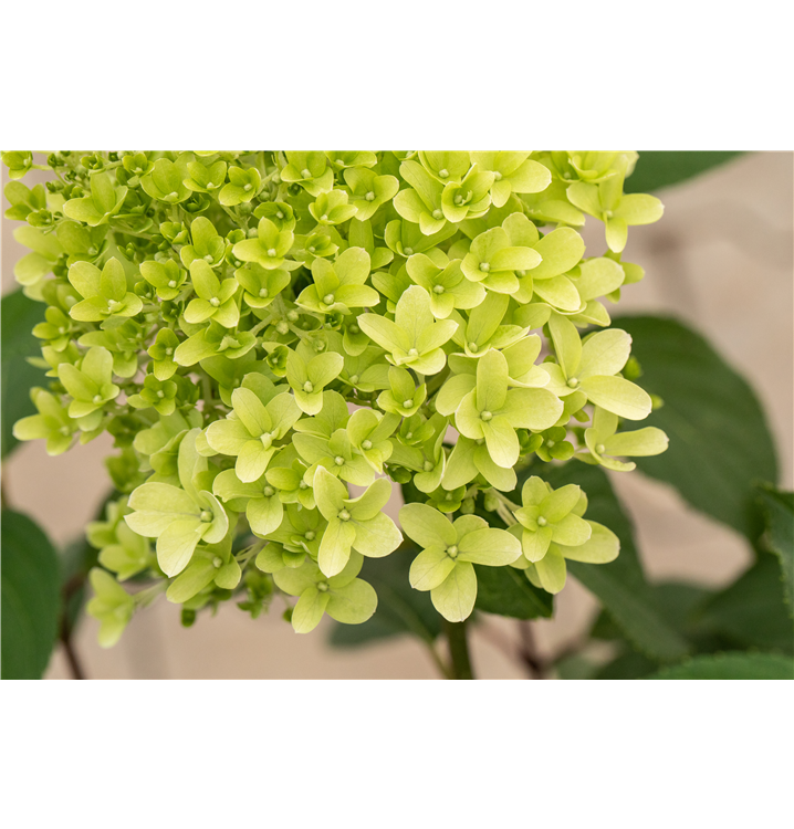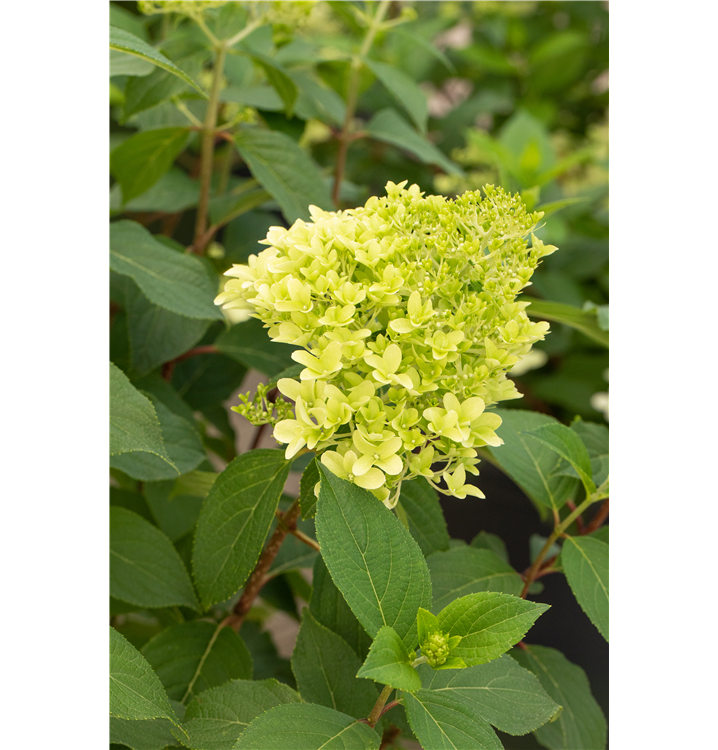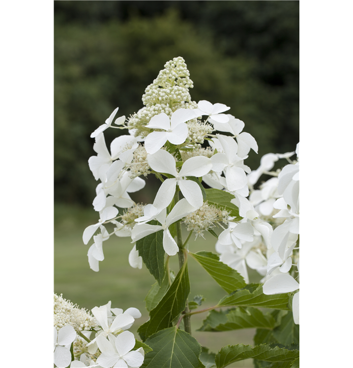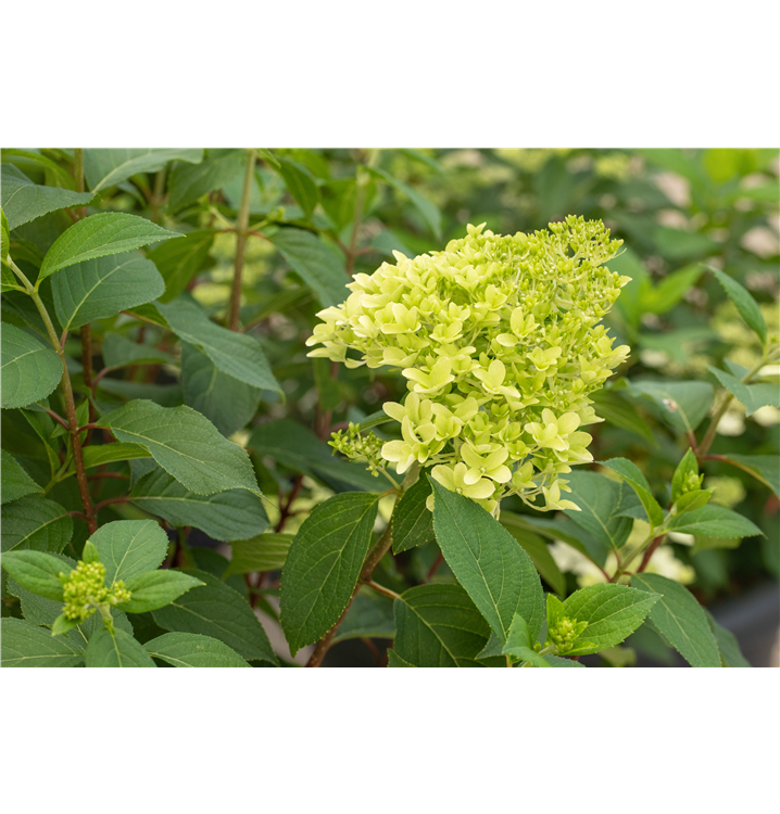 Die sommergrünen Blätter der Rispenhortensie 'Skyfall' sind mittelgrün, breit lanzettlich.