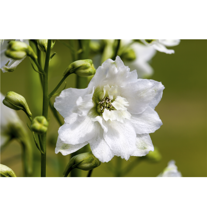 Delphinium pacific 'Galahad' bildet gefüllte, in Rispen angeordnete, weiße Blüten ab Juni. Bei richtiger Pflege Nachblüte von September bis Oktober.