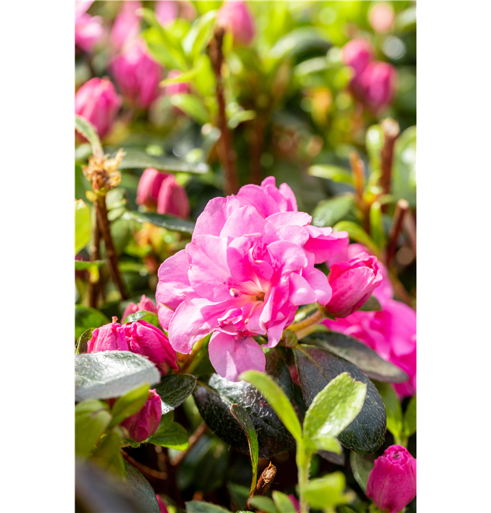 Japanische Azalee 'Rosinetta'® ist ein kompakt und rundlich wachsender Zwergstrauch. Sie erreicht gewöhnlich eine Höhe von 50 - 60 cm und wird ca. 70 - 80 cm breit.