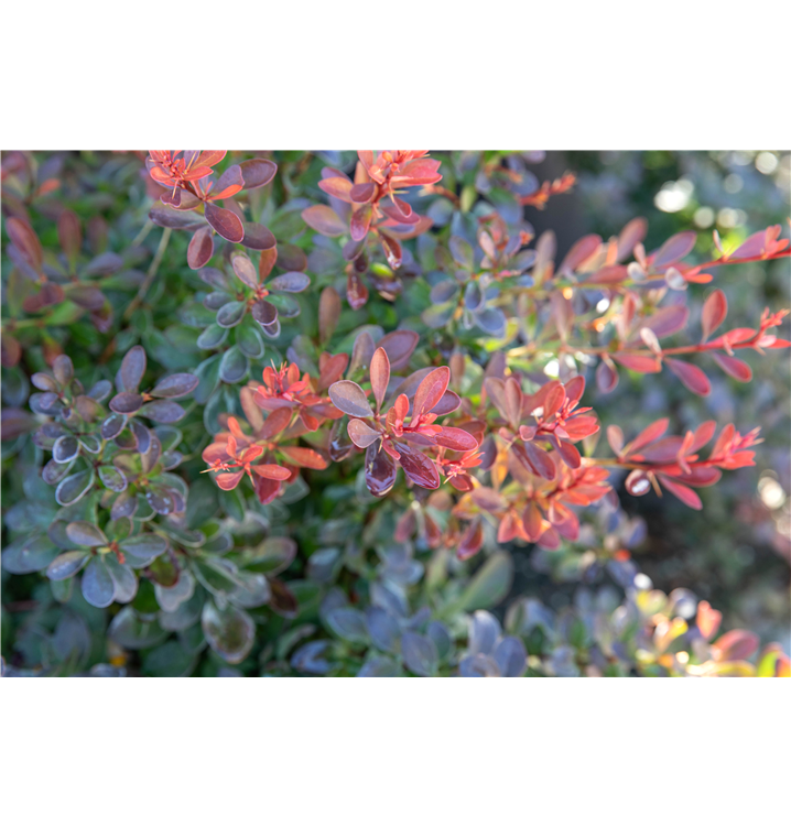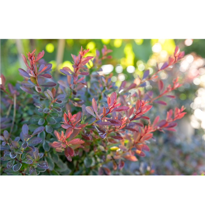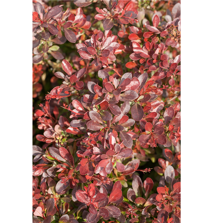 Die sommergrünen Blätter der Rote Zwergberberitze 'Bagatelle' sind purpurrot, eiförmig, wechselständig. Diese sind etwa 1 - 2 cm groß. Rote Zwergberberitze 'Bagatelle' zeigt sich leuchtend scharlachrot im Herbst.
