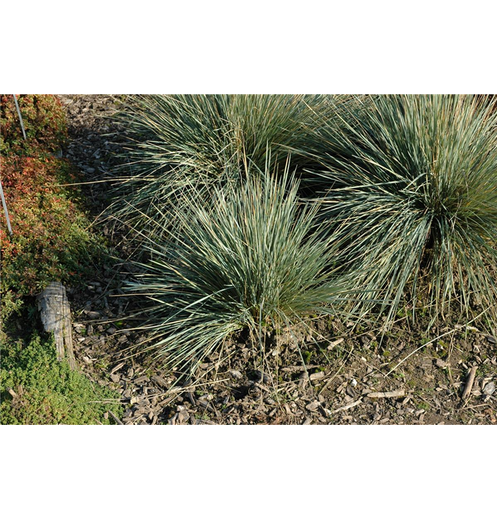 Hoher Blattschmuckwert. Die wintergrünen Blätter des Garten-Blaustrahlhafers 'Saphirsprudel' sind blau-grün, lineal.