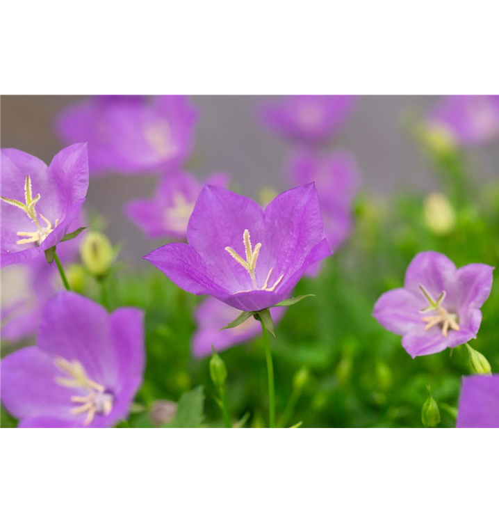 Campanula carpatica 'Pearl Deep Blue' bildet glockenförmige, blauviolette Blüten ab Juni.