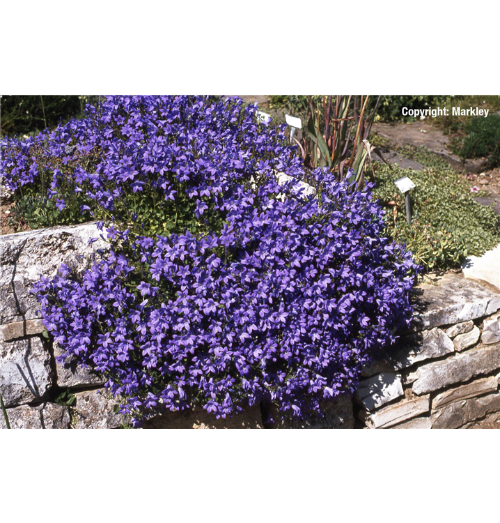 Die Polster-Glockenblume 'Nice to See' (Campanula portenschlagiana) ist eine aufrechte, polsterbildende wintergrüne Staude, die von Juni bis Juli violette, trichterförmige Blüten bildet. An einem sonnigen bis halbschattigen Standort mit durchlässigem, lockerem, nährstoffreichem Boden erreicht sie gewöhnlich eine Höhe von ca. 20 cm und wird ca. 30 cm breit. Die Polster-Glockenblume 'Nice to See' ist gut frostverträglich.