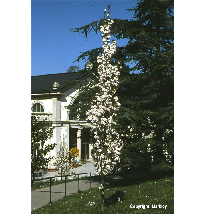 Japanische Säulenkirsche 'Amanogawa' ist ein säulenförmig und straff wachsender Großstrauch. Sie erreicht gewöhnlich eine Höhe von 4 - 7 m und wird ca. 1 - 2 m breit. In der Regel wächst sie 20 - 30 cm pro Jahr.