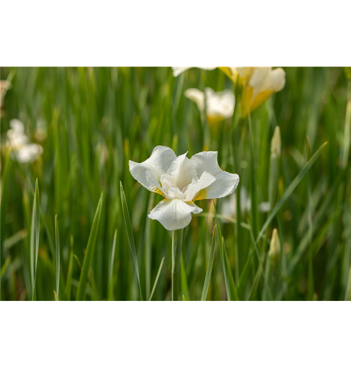 Die Bartlose Garten-Schwertlilie 'White Swirl' (Iris sibirica) ist mit ihren mittelgrünen Blättern eine ausgesprochen dekorative Wasserpflanze, die für solche Einsatzbereiche wie Schnitt, Bauerngarten, Teichrand, Balkon/Terrasse, Bachlauf und Gehölzrand besonders gut geeignet ist. Weiße Blüten erscheinen von Juni bis Juli. Sie bevorzugt humosen Boden in sonniger bis halbschattiger Lage. Die Bartlose Garten-Schwertlilie 'White Swirl' ist gut frostverträglich. Die aufrechte, rhizombildende Staude erreicht gewöhnlich eine Höhe von ca. 1,2 m.