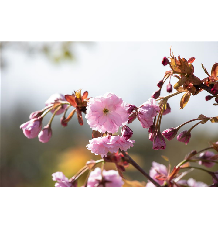 Die Hängende Nelkenkirsche 'Kiku-shidare-zakura' (Prunus serrulata) ist ein überhängender Kleinbaum mit dekorativen, ovalen, runden Früchten. Die rosafarbenen Blüten erscheinen von April bis Mai.
