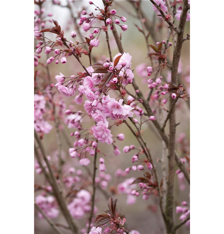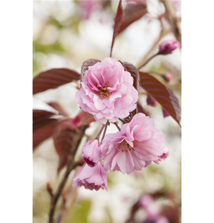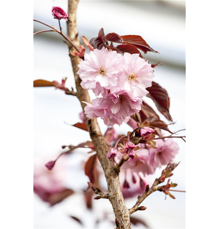 Die Japanische Nelkenkirsche 'Royal Burgundy'® (Prunus serrulata) ist ein ausladend wachsender, trichterförmiger Großstrauch mit dekorativen Früchten. Die rosafarbenen Blüten erscheinen von Ende April bis Anfang Mai. Zudem trägt die Japanische Nelkenkirsche 'Royal Burgundy'® dekorative, sommergrüne, eiförmige, purpurrote Blätter.