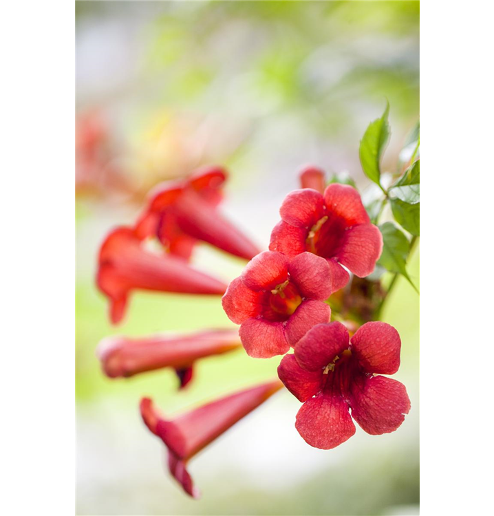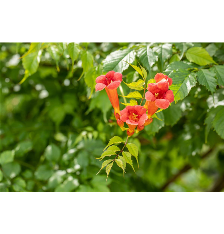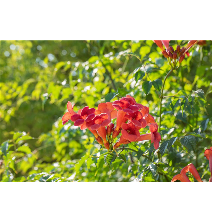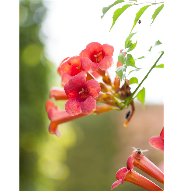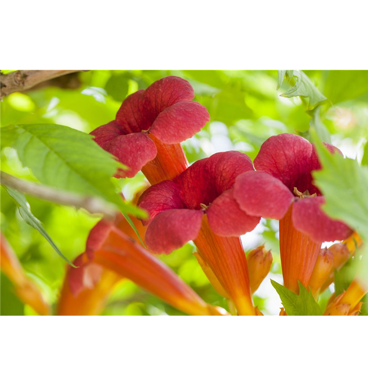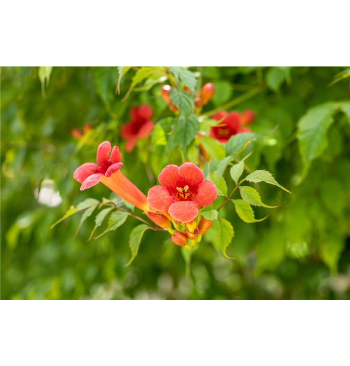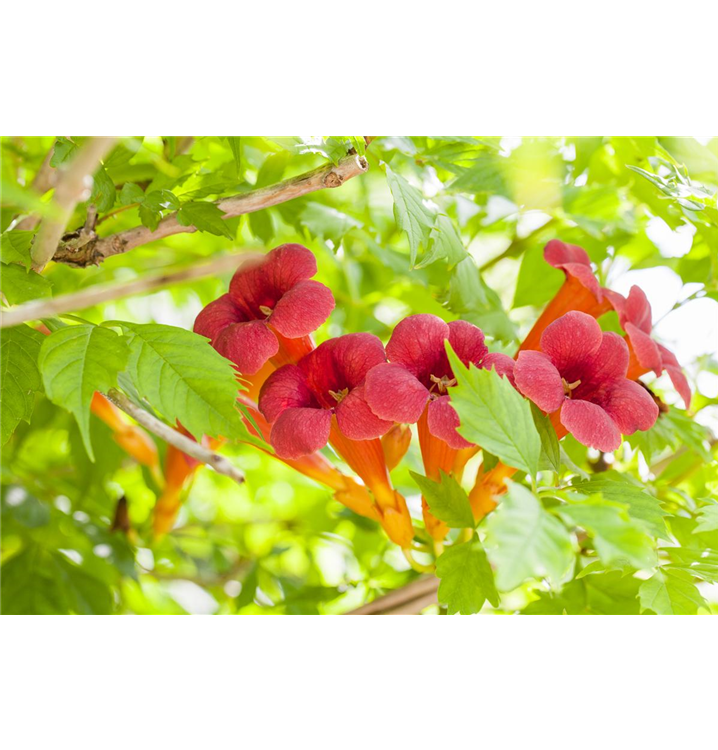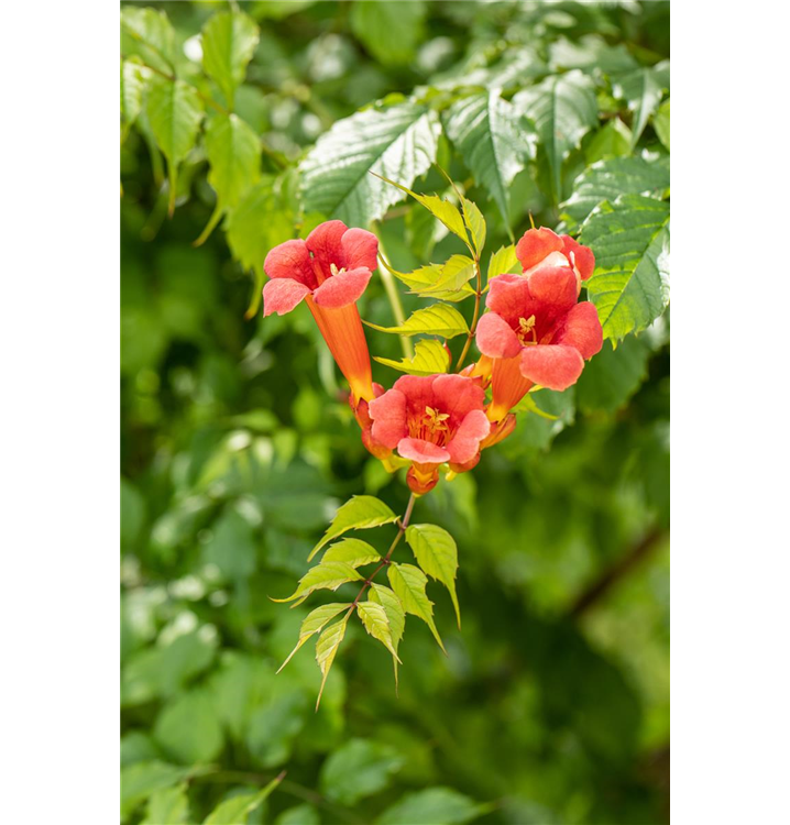 Die Trompetenblume 'Flamenco' (Campsis radicans) ist eine kletternde Gartenpflanze, die orange-rote, trichterförmige Blüten mit einem angenehmen Duft hervorbringt. Sie erscheinen von Juli bis September. An einem sonnigen bis halbschattigen Standort mit durchlässigem, nährstoffreichem Boden erreicht sie gewöhnlich eine Höhe von ca. 3,5 m und wird ca. 2,5 m breit.