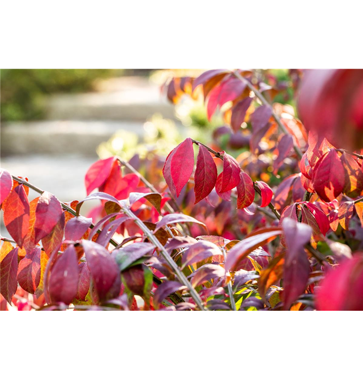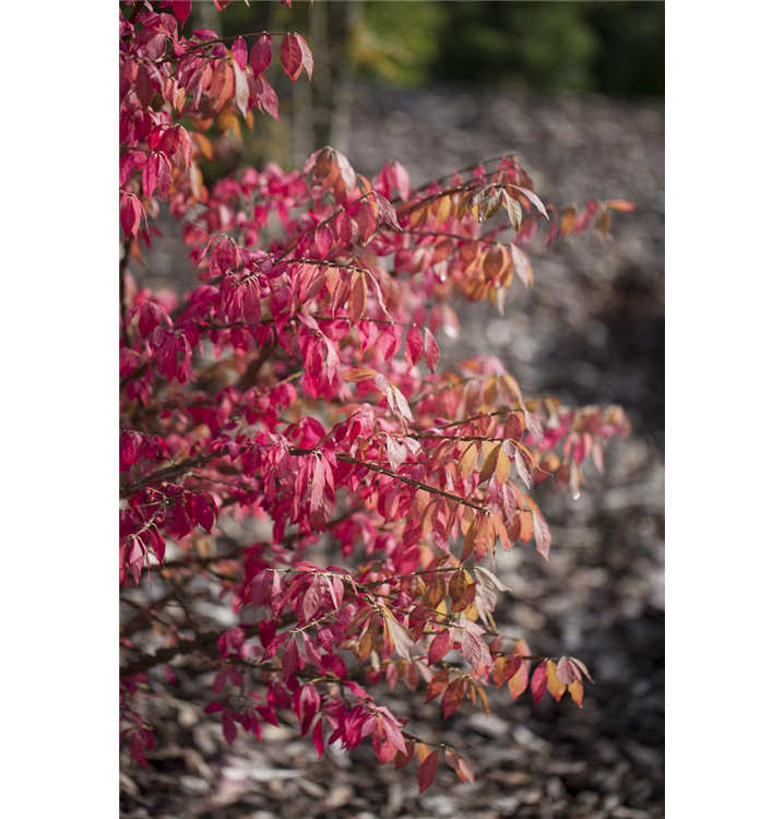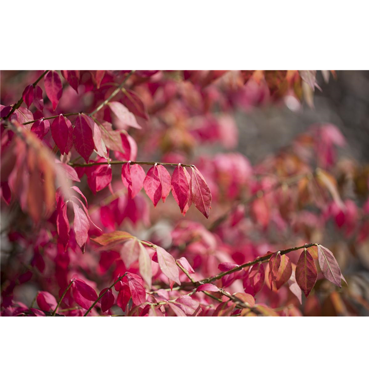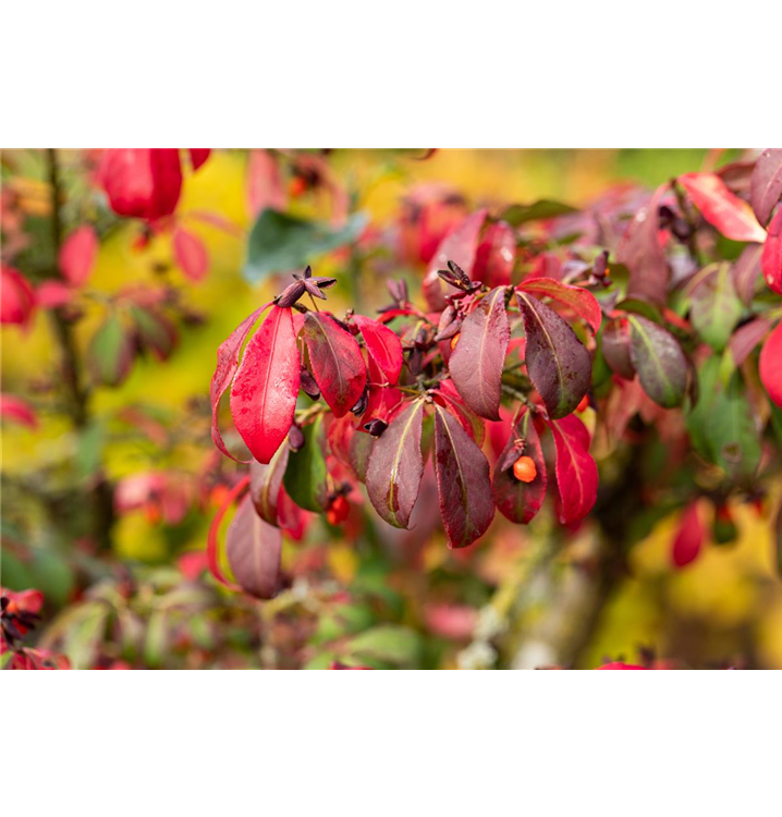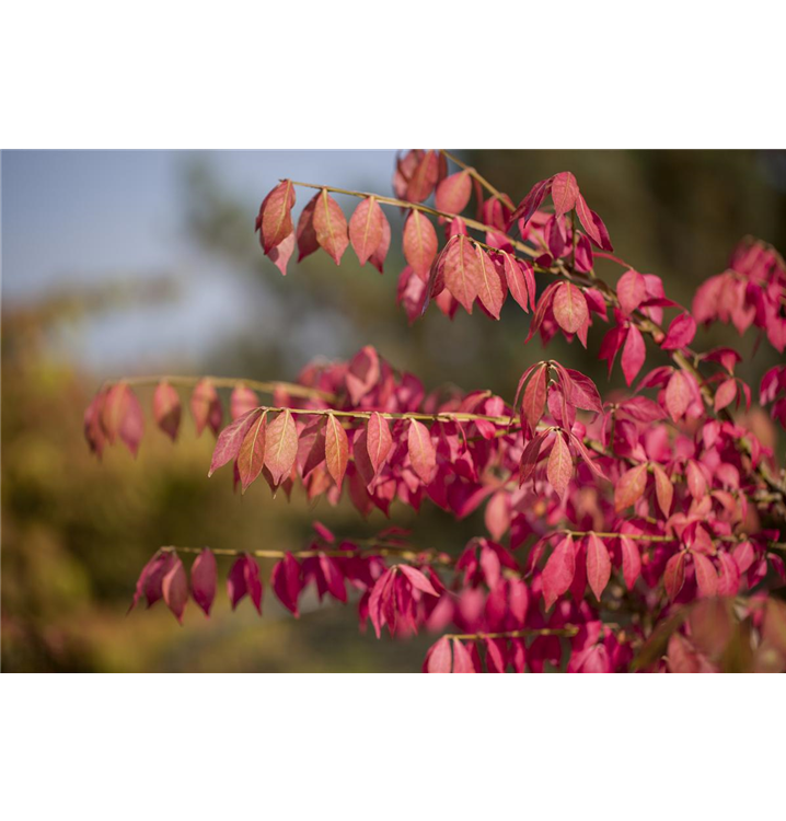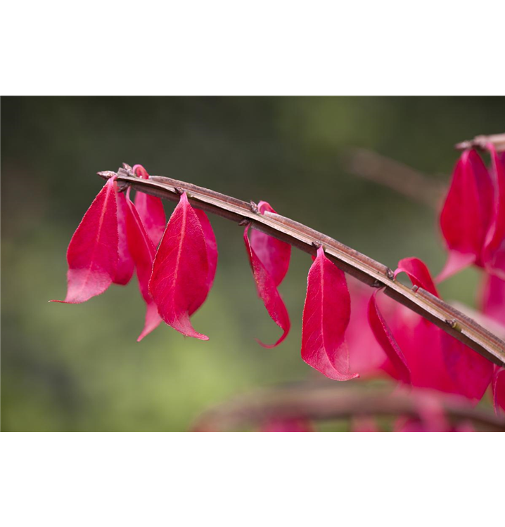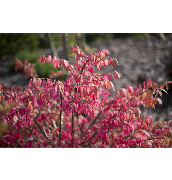 Besonders dekorativ sind die orange-roten Früchte von Euonymus alatus. Diese erscheinen ab Anfang September.