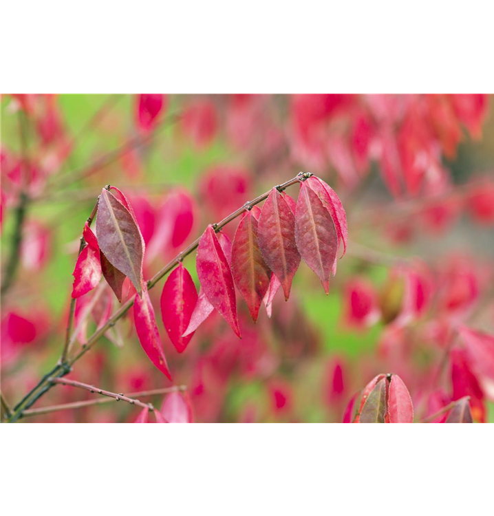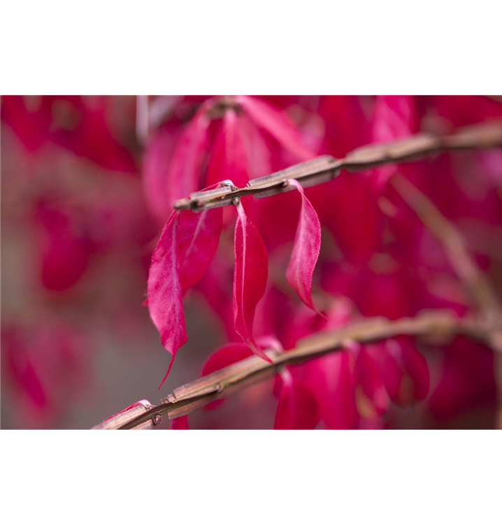 Die sommergrünen Blätter des Korkflügelstrauchs sind dunkelgrün, eiförmig, gegenständig. Diese sind etwa 3 - 5 cm groß. Korkflügelstrauch zeigt sich leuchtend karminrot im Herbst.