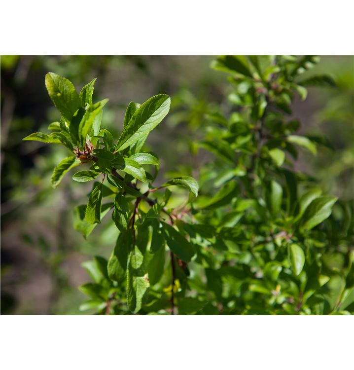 Die blau-grauen Steinfrüchte haben einen süß-säuerlichen Geschmack. Die Steinfrüchte sind rund. Reifezeit ab September.
