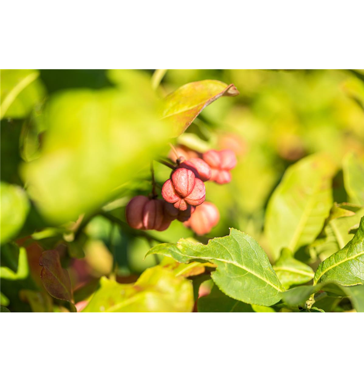 Besonders dekorativ sind die rosaroten Früchte von Euonymus europaeus. Diese erscheinen ab August.