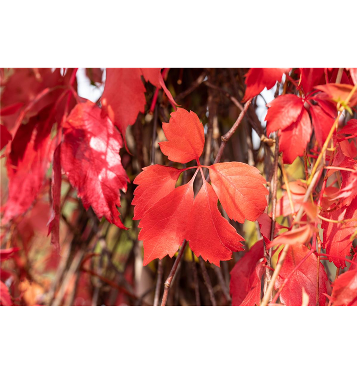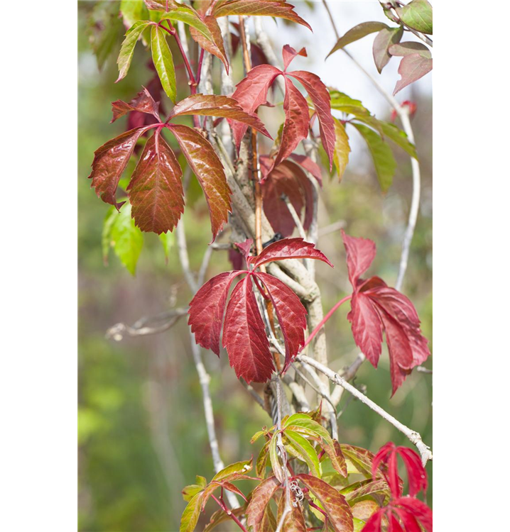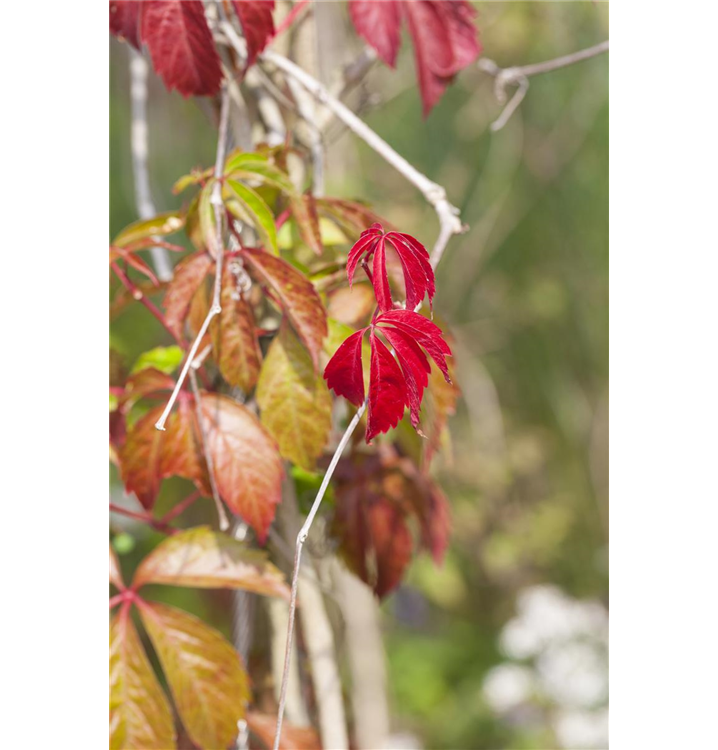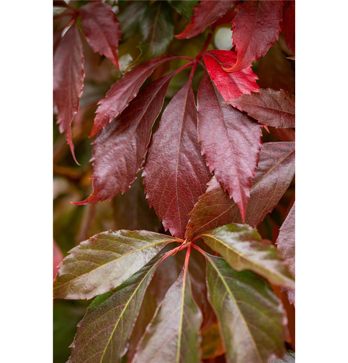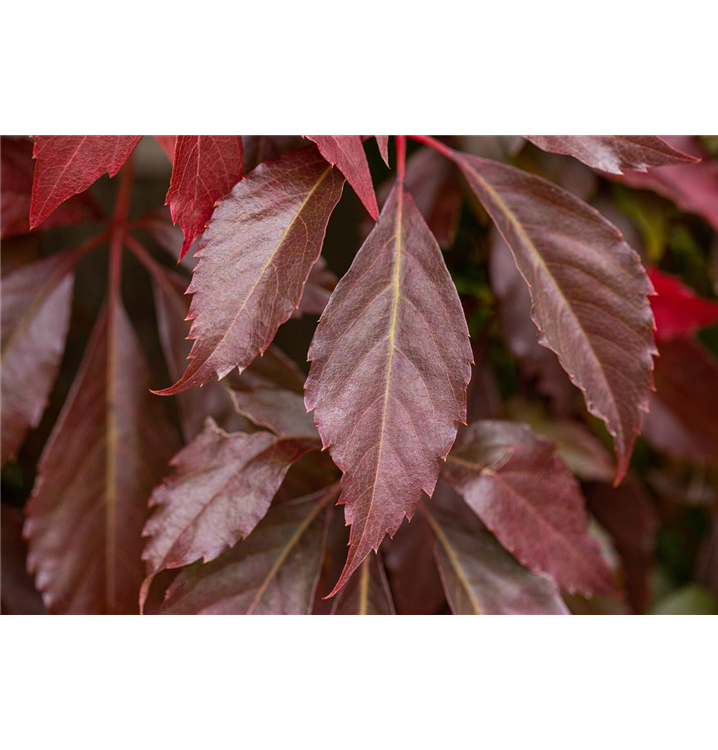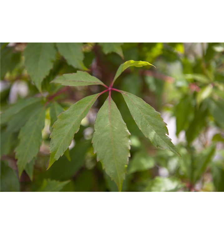Die sommergrünen Blätter des Mauerweins 'Engelmannii' sind dunkelgrün, handförmig, gezähnt. Diese sind etwa 10 - 12 cm groß. Mauerwein 'Engelmannii' zeigt sich leuchtend scharlachrot im Herbst.