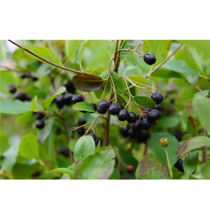 Die Apfelbeere 'Viking' (Aronia x prunifolia) bildet glänzende, schwarze, kleine Früchte. Sie sind rund oder flach und haben einen süßen Geschmack. Für eine ertragreiche Ernte ab September schaffen durchlässiger, humoser, nährstoffreicher Boden und ein sonniger bis halbschattiger Standort optimale Bedingungen. Auch ihre weißen Blüten sind eine schöne Erscheinung.