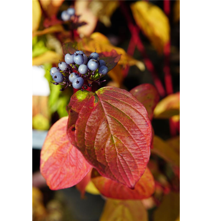 Besonders dekorativ sind die weiß-blauen, runden Beeren von Cornus alba 'Sibirica'. Diese erscheinen ab September.