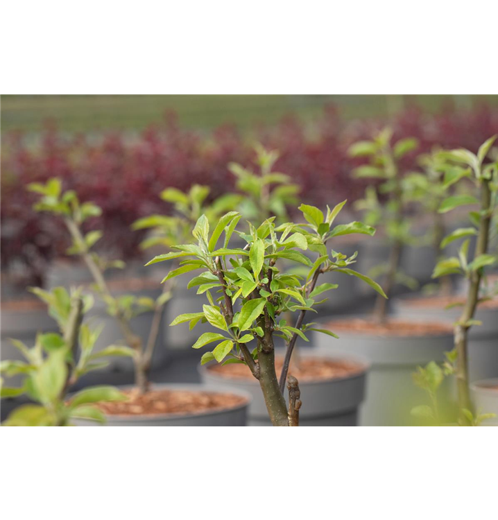 Zierapfel 'John Downie' ist ein aufrecht wachsender Großstrauch. Er erreicht gewöhnlich eine Höhe von 4 - 6 m und wird ca. 3 - 4 m breit.