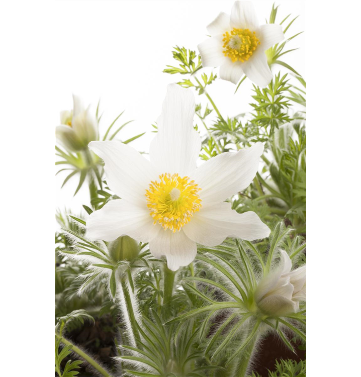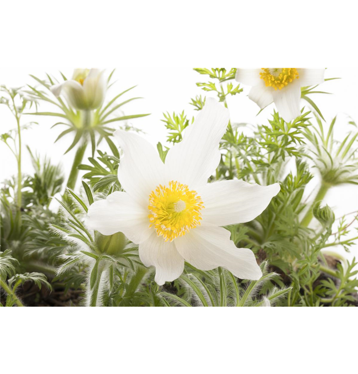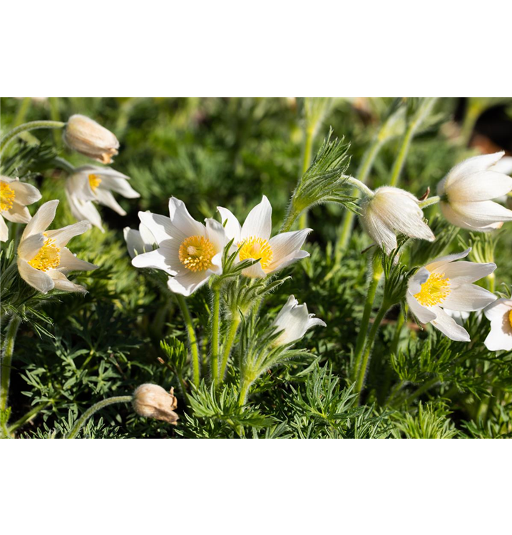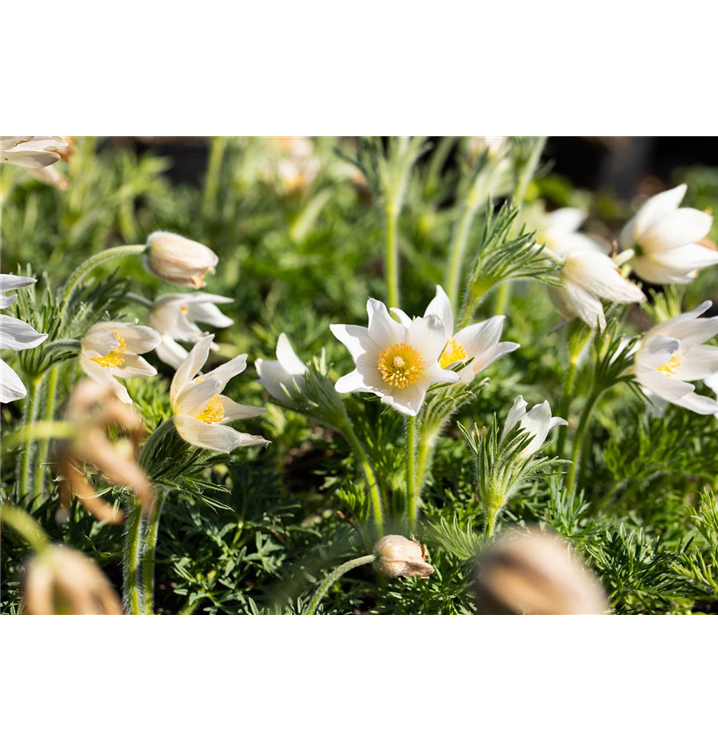 Die Weißblühende Garten-Kuhschelle 'Alba' (Pulsatilla vulgaris) ist eine aufrechte Staude, die dekorative silbrige Früchte bildet. An einem sonnigen Standort mit durchlässigem, humosem Boden erreicht sie gewöhnlich eine Höhe von ca. 25 cm und wird ca. 30 cm breit. Die Weißblühende Garten-Kuhschelle 'Alba' ist gut frostverträglich.