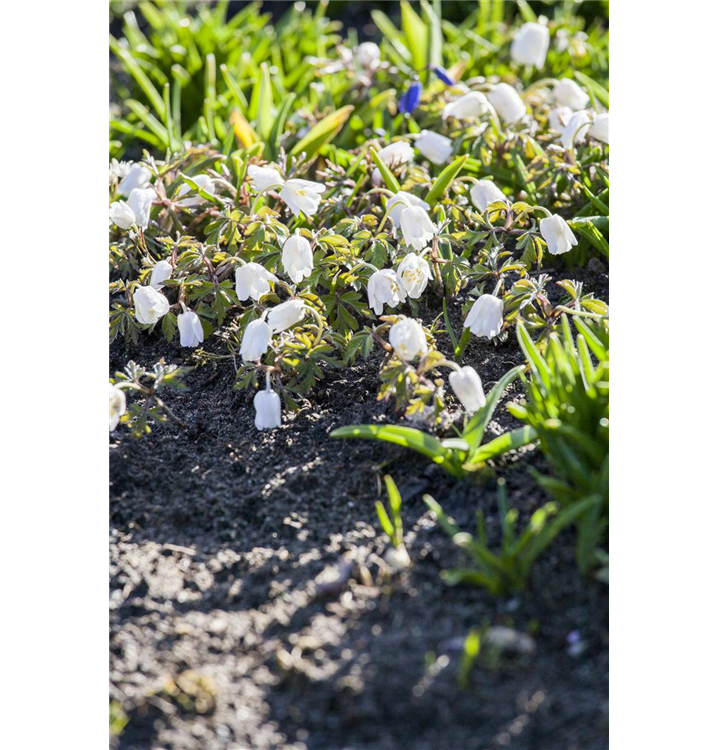 Pulsatilla vulgaris 'Alba' bildet glockenförmige, weiße Blüten ab März.