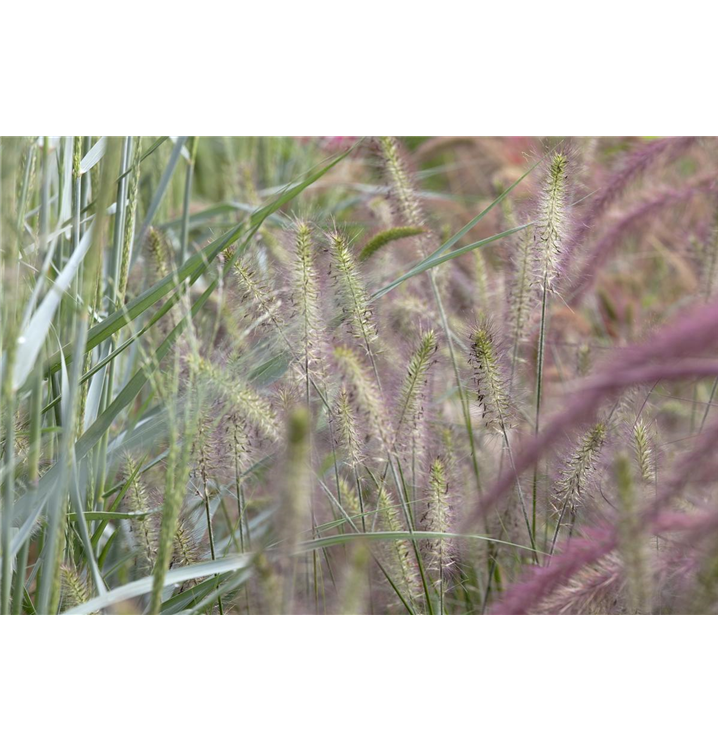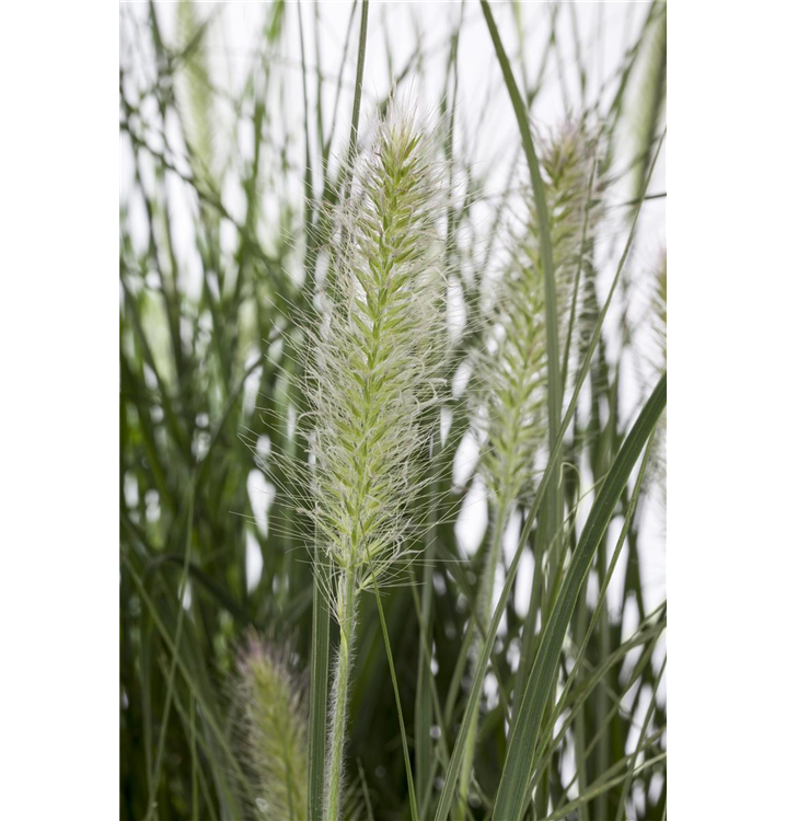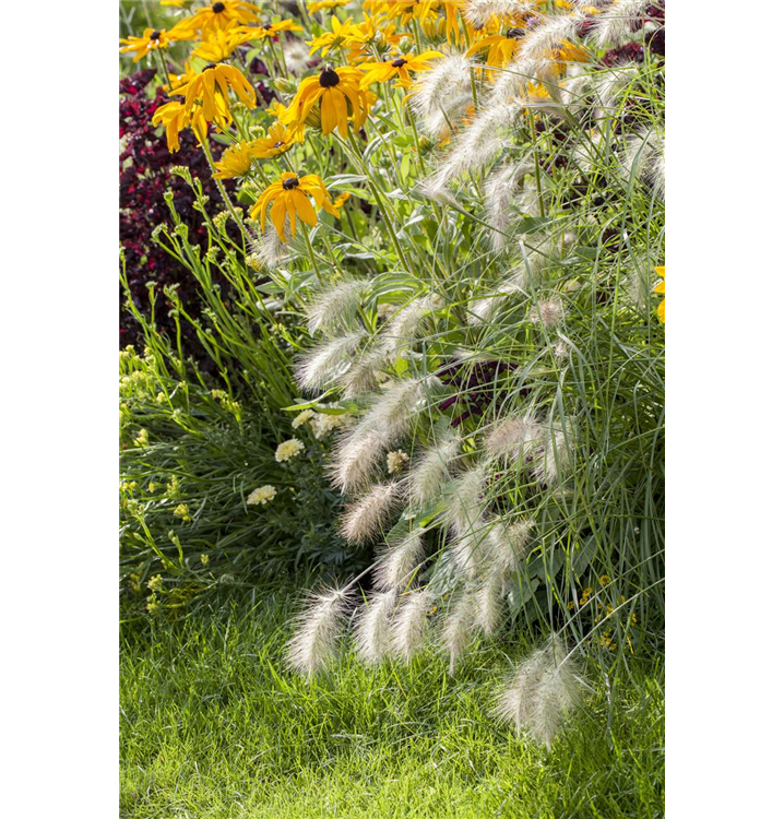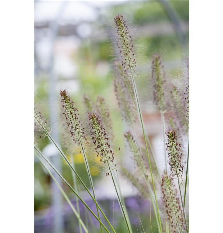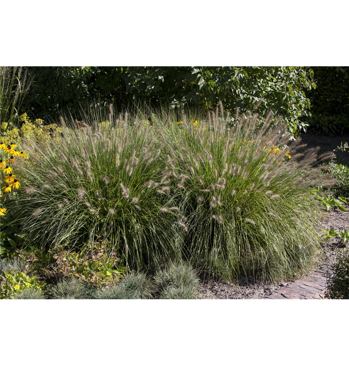 Das Garten-Federborstengras 'Hameln' (Pennisetum alopecuroides) ist mit seiner dunkelgrünen Blattfärbung ein dekoratives Gestaltungselement im Garten, welches sich an einem sonnigen Standort mit einem möglichst durchlässigen, nährstoffreichen Boden am wohlsten fühlt. Die goldgelben Blütenwedel schmücken die buschig, aufrecht und horstbildend wachsende Pflanze ab Sommer. Bei günstigen Bedingungen erreicht dieses winterharte Gras eine Höhe von ca. 80 cm und wird bis zu 50 cm breit.