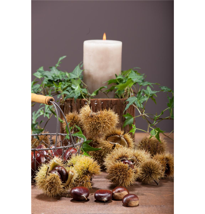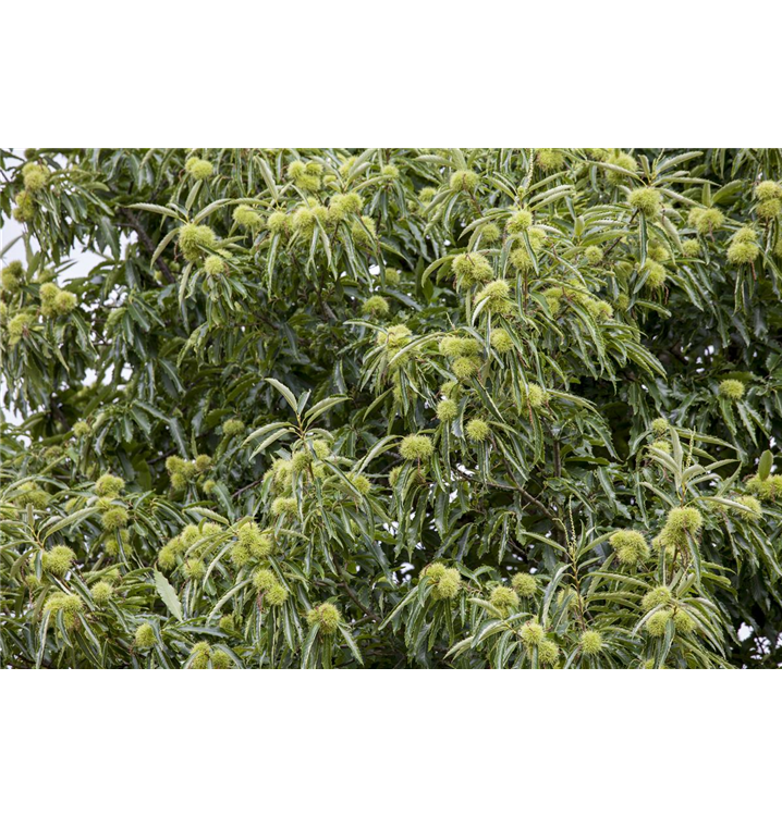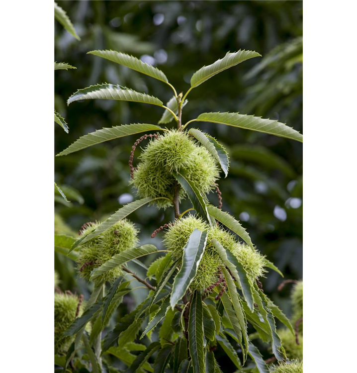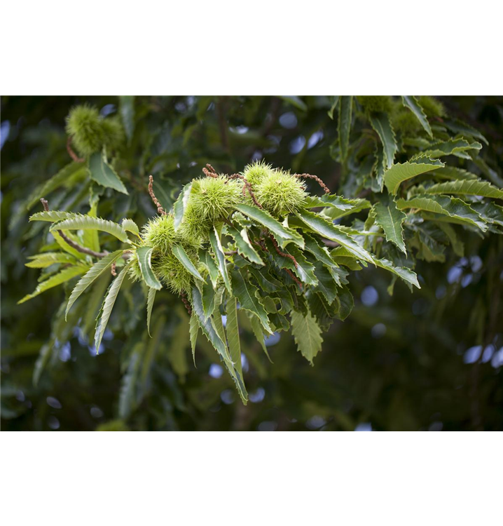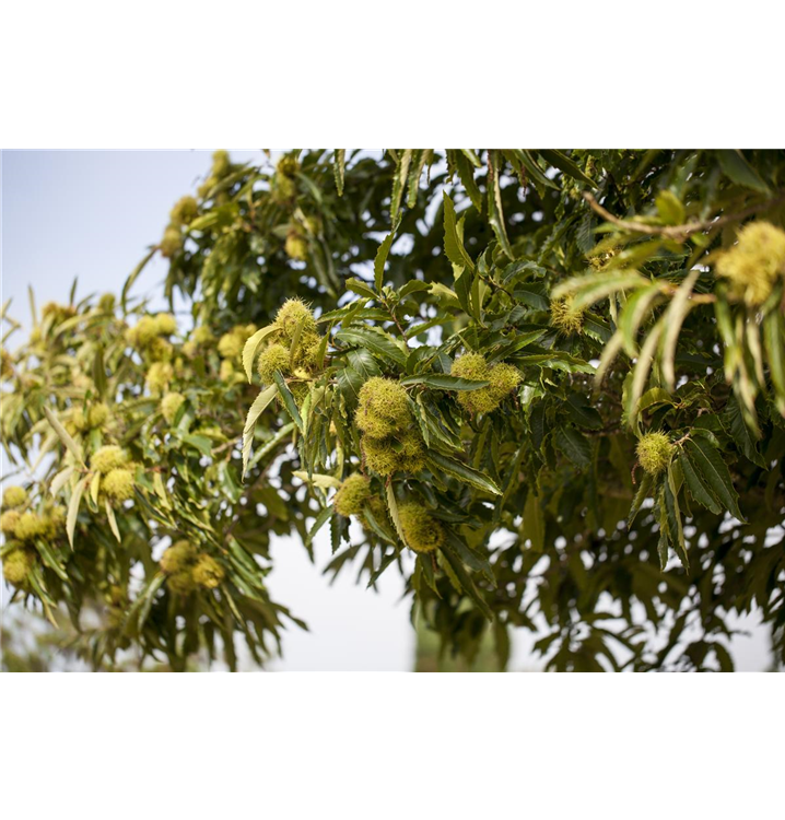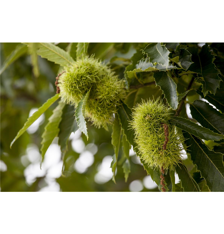 Castanea sativa bildet braune Früchte mit einem mehligen Geschmack. Die Fruchtschale ist stachelig. Reifezeit ab Oktober.