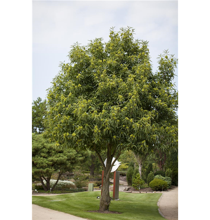 Die Esskastanie (Castanea sativa) ein ausladender Großbaum, der, je nach Sorte, Blüten in verschiedenen Farben hervorbringt. Ihre Rinde ist dunkelgrau, netzartig eingerissen. An einem sonnigen bis halbschattigen Standort mit durchlässigem, nährstoffreichem, saurem Boden erreicht sie gewöhnlich eine Höhe von ca. 30 m und wird ca. 15 m breit.
