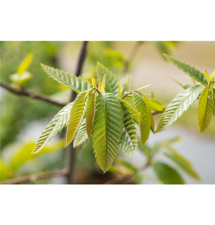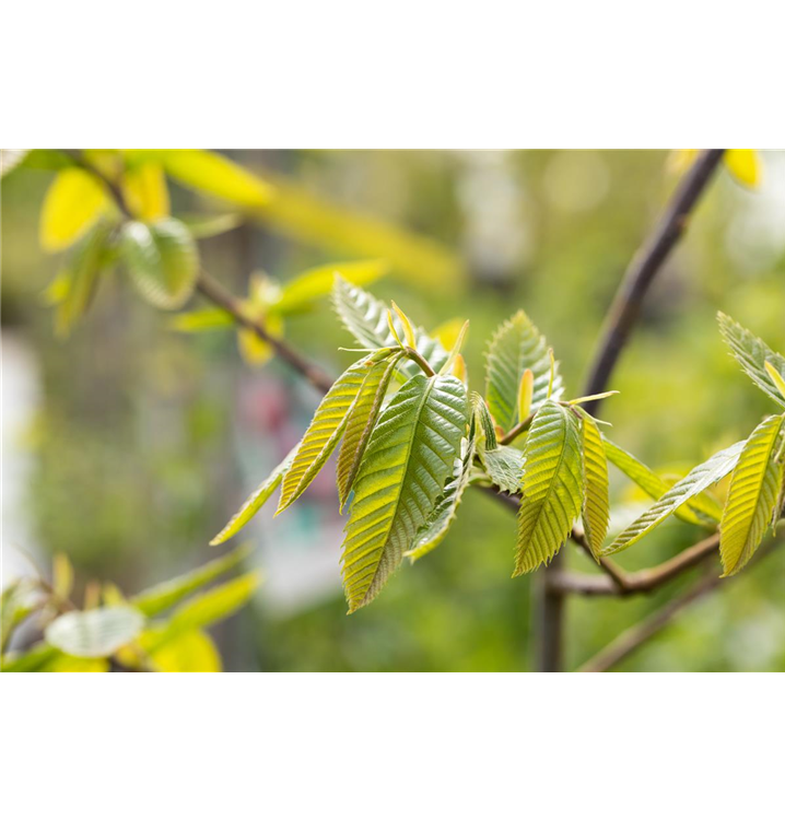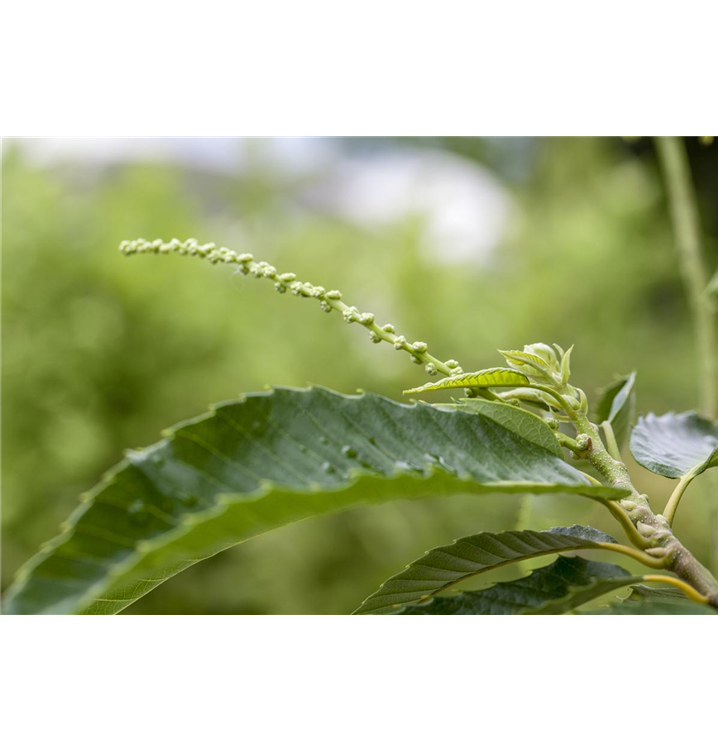Die sommergrünen Blätter der Esskastanie sind dunkelgrün, lanzettlich, glänzend, wechselständig, gesägt. Esskastanie zeigt sich leuchtend goldgelb im Herbst.