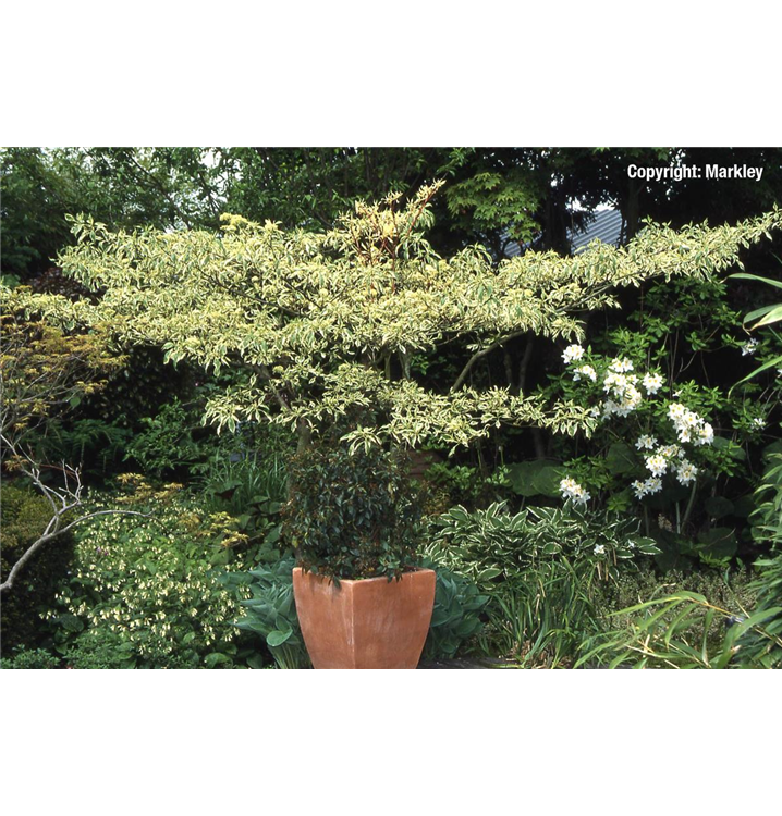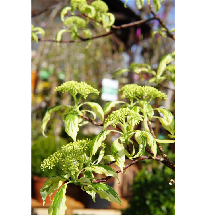 Der Hohe weißbunte Etagen-Hartriegel 'Variegata' (Cornus controversa) ist ein kegelförmiger Großstrauch mit dekorativen, schwarz-blauen Früchten. Die cremeweißen, in Schirmtrauben angeordneten Blüten erscheinen von Mai bis Juli. Zudem trägt der Hohe weißbunte Etagen-Hartriegel 'Variegata' dekorative, sommergrüne, eiförmige, dunkelgrüne Blätter mit einem weißen Rand. Auch der grüngelbe Austrieb ist sehr schön.