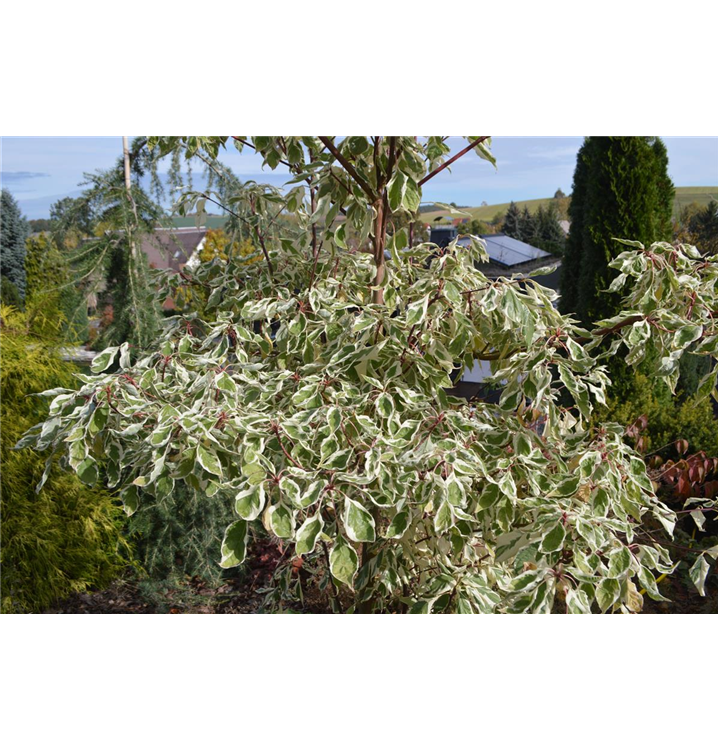 Hoher Weißbunter Etagen-Hartriegel 'Variegata' ist ein kegelförmig wachsender Großstrauch. Er erreicht gewöhnlich eine Höhe von 4 - 6 m und wird ca. 3 - 4 m breit. In der Regel wächst er 20 - 30 cm pro Jahr.