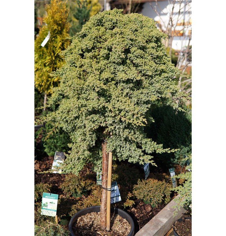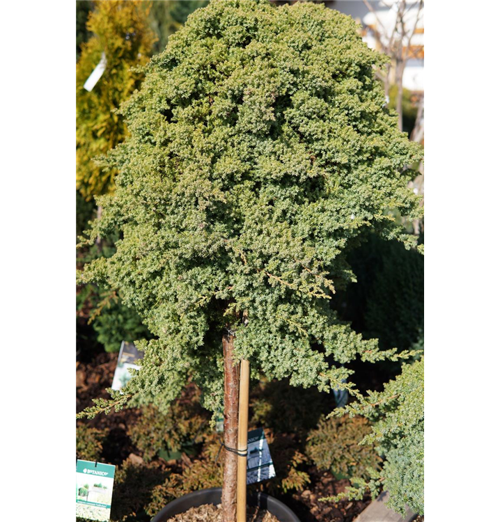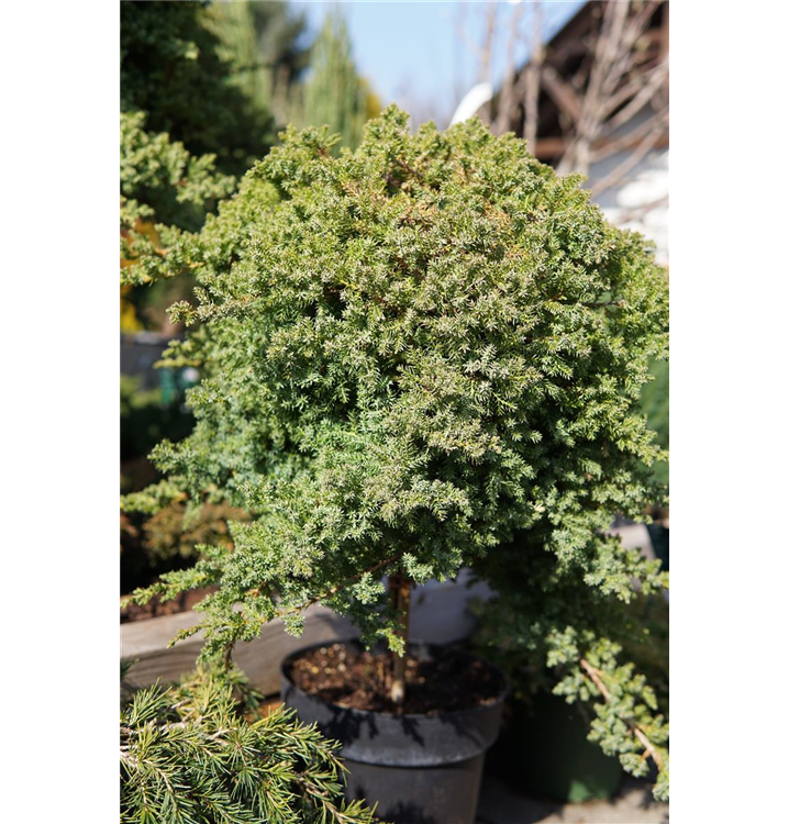 Der Niedere Zwergwacholder 'Nana' (Juniperus procumbens) ist ein Zwergstrauch, welcher flach, kriechend, zwergwüchsig wächst und gewöhnlich eine Höhe von ca. 20 cm und eine Breite von ca. 1,5 m erreicht. Seine nadelförmigen Blätter haben eine blau-grüne Färbung. Dieses Gehölz ist gut frostverträglich. Er bevorzugt durchlässigen, nährstoffreichen Boden in sonniger bis halbschattiger Lage.