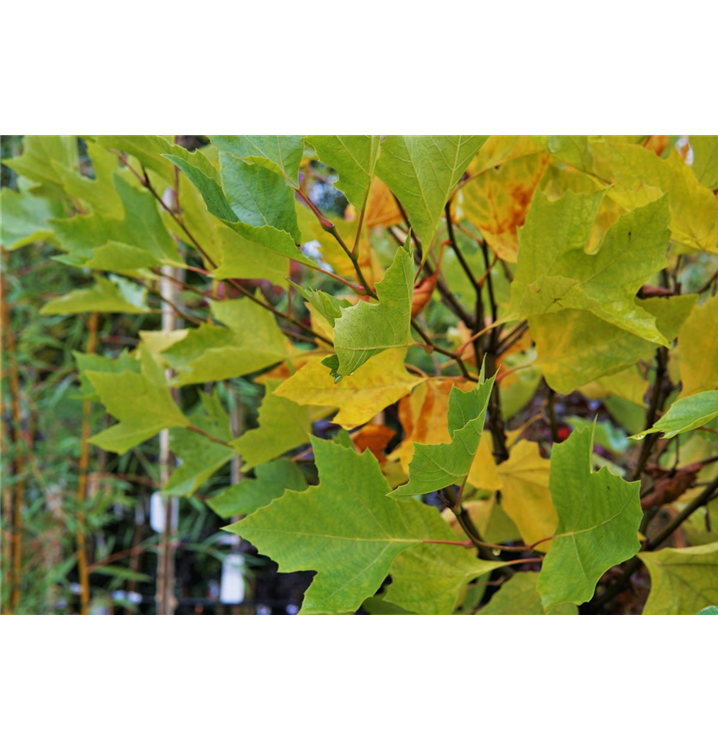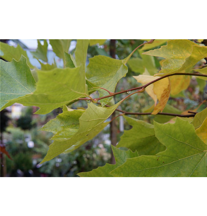 Die sommergrünen Blätter der Ahornblättrige Platane 'Alphens Globe' sind dunkelgrün, dreieckig, ledrig, wechselständig, gezähnt. Diese sind etwa 12 - 25 cm groß. Ahornblättrige Platane 'Alphens Globe' zeigt sich leuchtend gelb im Herbst. Lange haftend.