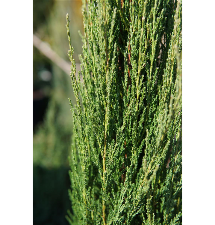 Der Virginische Wacholder 'Blue Arrow' ist immergrün. Seine Nadeln sind blau-grau, schuppenförmig.