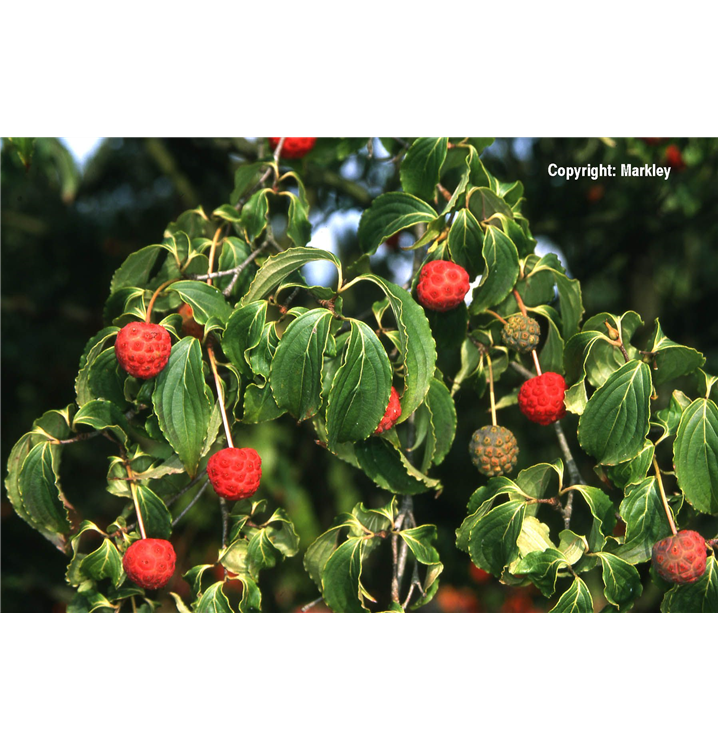 Besonders dekorativ sind die dunkelrosafarbenen, runden Beeren von Cornus kousa 'Satomi'®. Diese erscheinen ab September.