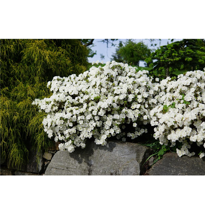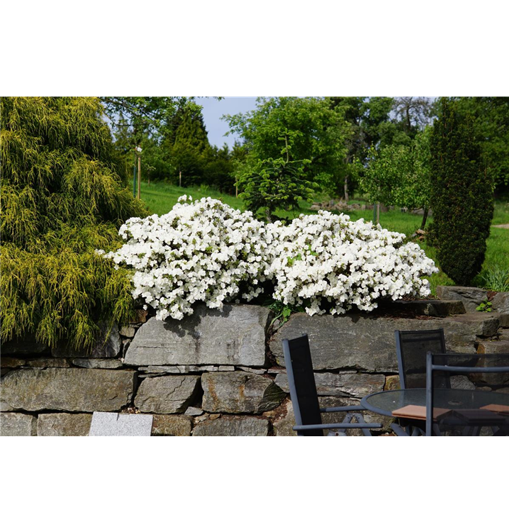 Die Japanische Azalee 'Schneeperle'® (Rhododendron obtusum) bringt von Mitte Mai bis Mitte Juni ein wahres Meer aus weißen Blüten hervor. Dieses aufrecht, gedrungen wachsende Gehölz erreicht gewöhnlich eine Höhe von 40 - 50 cm und eine Breite von 50 bis 60 cm. Ein halbschattiger (bis schattiger) Standort und ein durchlässiger, nährstoffreicher, saurer Boden schaffen optimale Bedingungen für ein gesundes Wachstum. Die Japanische Azalee 'Schneeperle'® ist gut frostverträglich.