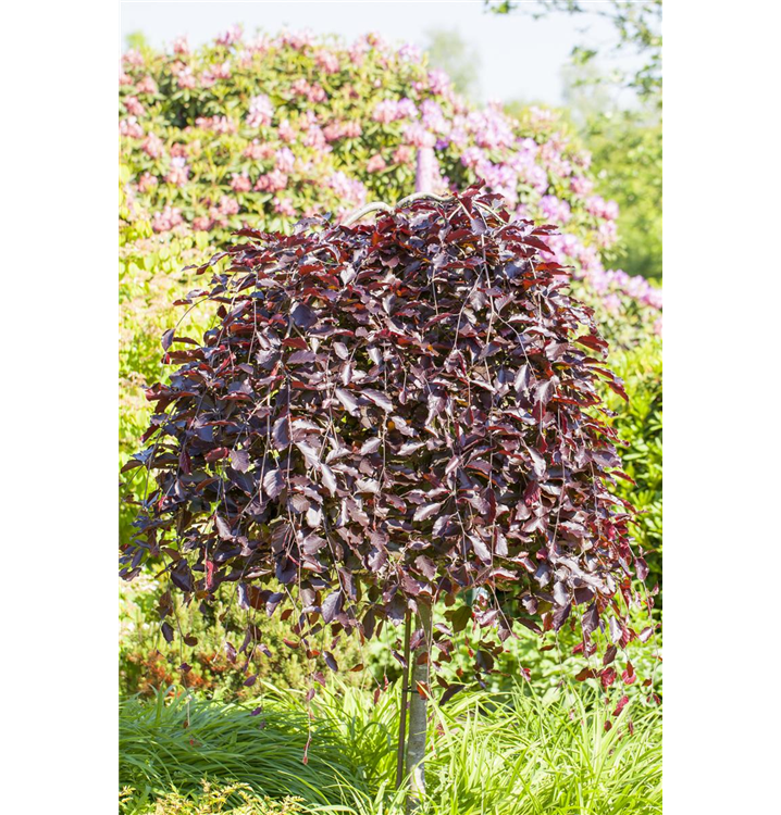 Die Schwarzrote Hängebuche 'Purpurea Pendula' (Fagus sylvatica) ist ein hängender, Kleinbaum mit dekorativen sommergrünen, eiförmigen, schwarz-roten Blättern. Auch der dunkelrote Austrieb ist sehr schön.