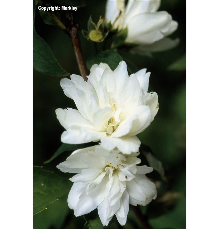 Die weißen, starkgefüllten, schalenförmigen Blüten des Gartenjasmin 'Schneesturm' erscheinen in Trauben von Juni bis Juli. Diese werden etwa 4 - 5 cm groß und sind stark duftend.