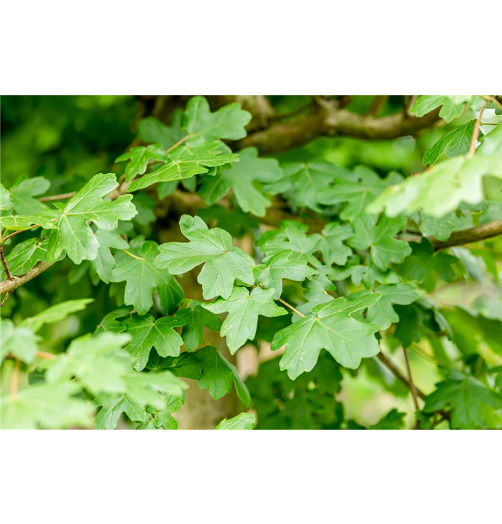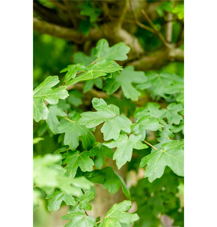 Die sommergrünen Blätter des Kugel-Feldahorns 'Nanum' sind dunkelgrün, gegenständig, gelappt. Diese sind etwa 5 - 10 cm groß. Kugel-Feldahorn 'Nanum' zeigt sich leuchtend orangegelb im Herbst.