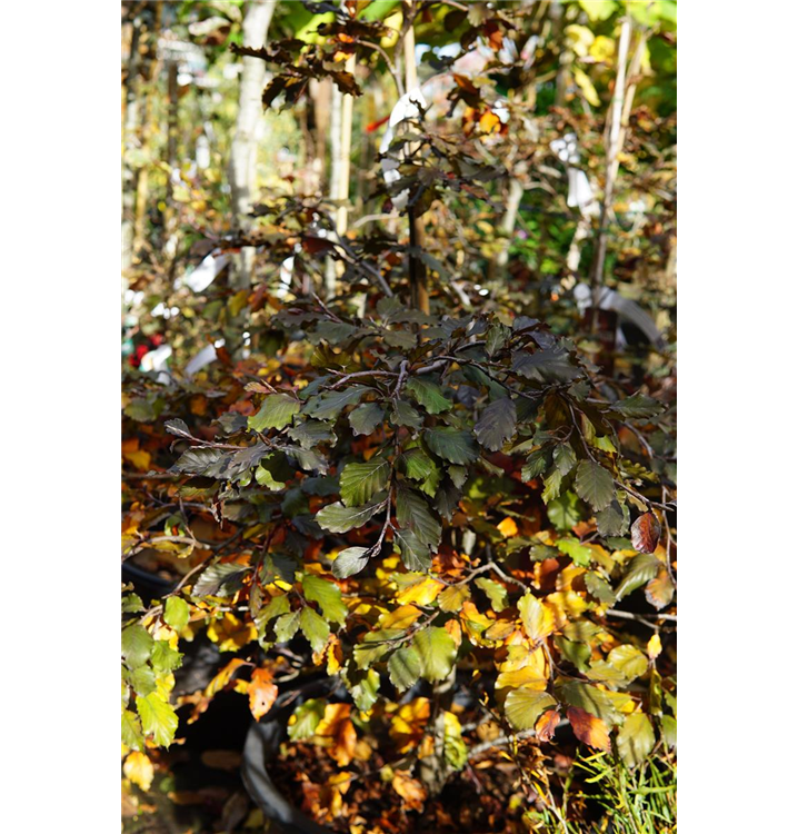 Fagus sylvatica 'Tortuosa Purpurea' ist ein Herzwurzler und bildet, je nach Boden, fein verzweigte Wurzeln.