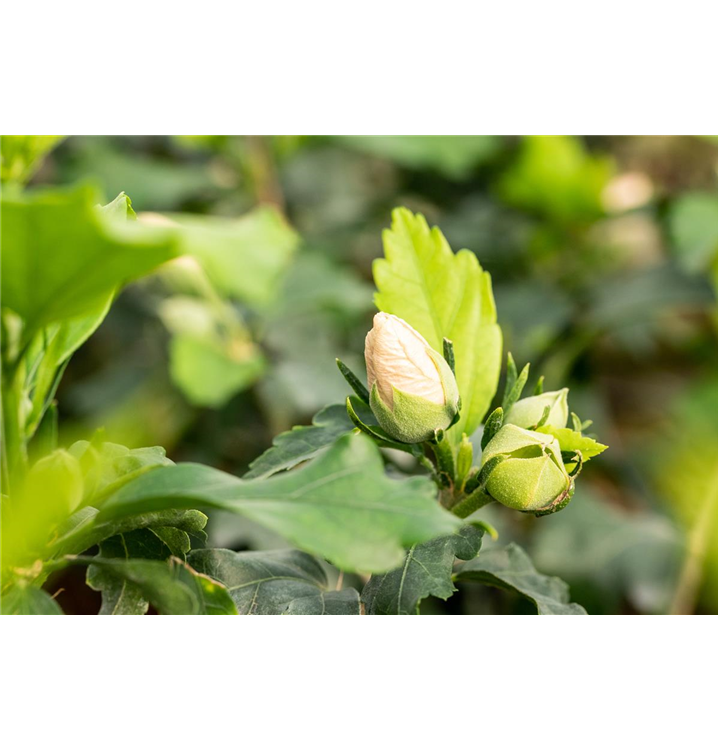 Die sommergrünen Blätter des Garteneibischs 'Helene' sind mittelgrün, eiförmig, wechselständig, gelappt.