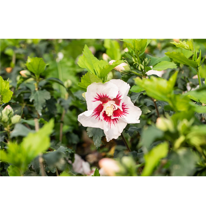 Der Garteneibisch 'Helene' (Hibiscus syriacus) ist ein aufrechter, strauchartiger Strauch, der zweifarbige, schalenförmige Blüten hervorbringt. Sie erscheinen von Juli bis September. An einem sonnigen bis halbschattigen, windgeschützten Standort mit durchlässigem, nährstoffreichem Boden erreicht er gewöhnlich eine Höhe von ca. 3 m und wird ca. 1,5 m breit.