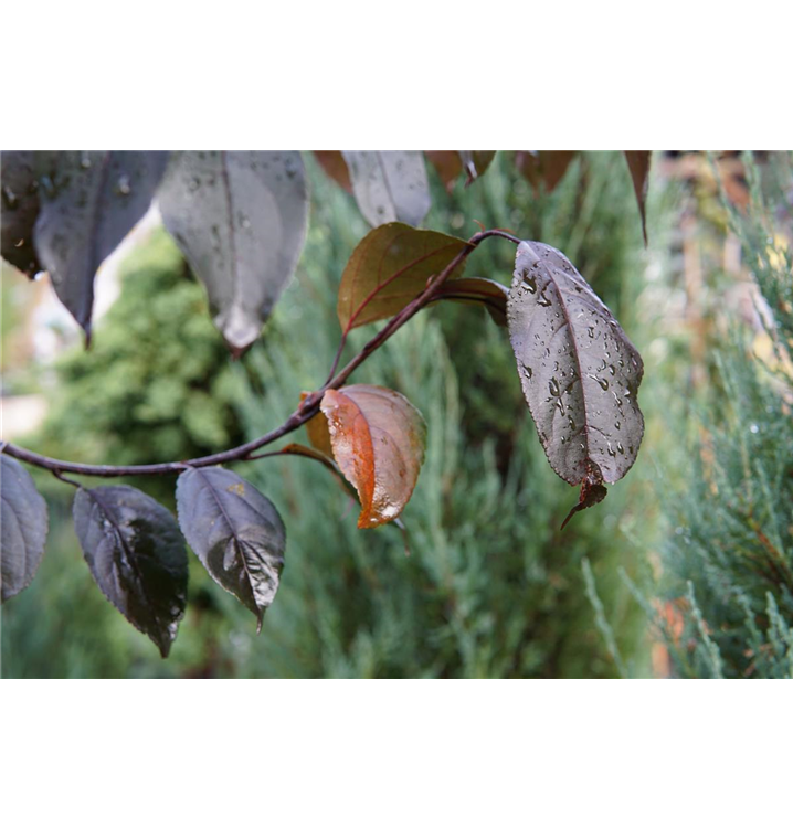 Besonders dekorativ sind die dunkelroten, ovalen Früchte von Malus 'Royalty'. Diese erscheinen ab Oktober und sind klein.